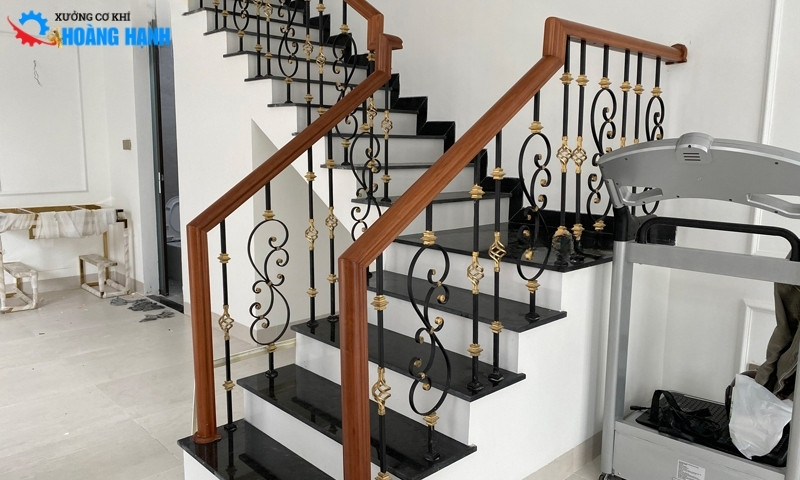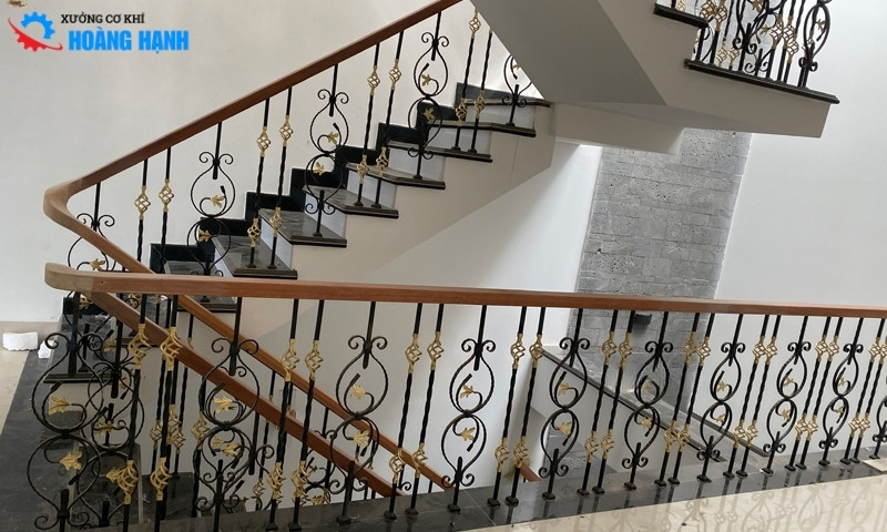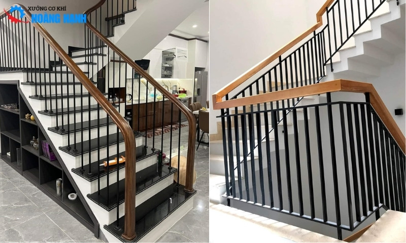 • Sắt và gỗ: Tay vịn bằng gỗ tự nhiên kết hợp với các con tiện bằng sắt là một sự phối hợp kinh điển. Vẻ cứng cáp, lạnh lùng của kim loại được cân bằng bởi sự ấm áp, mộc mạc của gỗ, tạo nên một tổng thể hài hòa và sang trọng.
