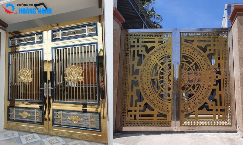- Cổng inox mạ PVD vàng: Công nghệ mạ PVD tiên tiến giúp tạo ra lớp mạ màu vàng gương, vàng hồng… cực kỳ sang trọng và bền màu. Đây là xu hướng đang rất được ưa chuộng tại các công trình biệt thự, khách sạn cao cấp.